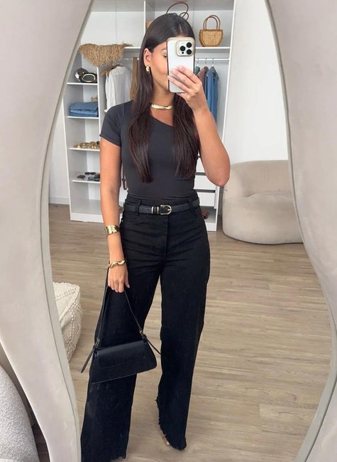 Calça Jeans Preta , com modelagem estilo larga cintura alta e barra desfiada. Ela é indispensável para o guarda roupas! Combina com qualquer parte de cima e fica perfeita com uma terceira peça.