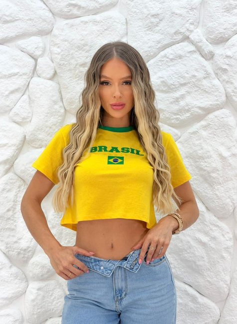 Quer um look perfeito? Aposte no Cropped Brasil com Manga , com tecido em Poliester e decote em U, ele traz um visual casual para seu look!