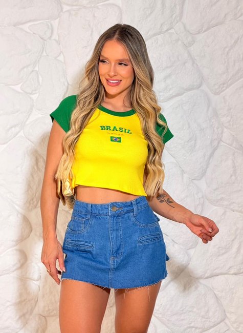 Cropped Brasil em ribana com modelagem ajustada e confortável, valorizando o corpo. Possui gola e mangas contrastantes e estampa “BRASIL” em destaque, trazendo um visual moderno e estiloso. Versátil, combina fácil com peças de cintura alta 💚💛