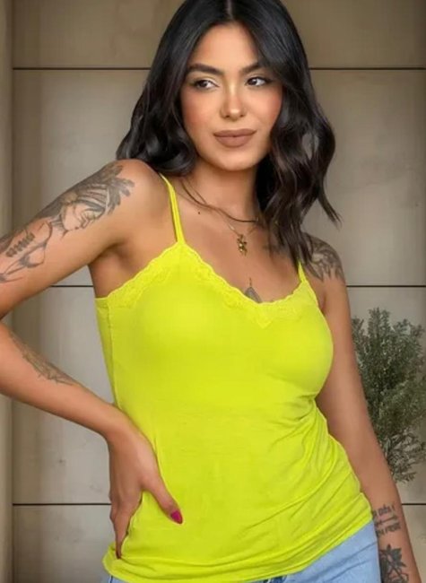 Regata com gola em V, com bojo e detalhe em renda na gola. Básica e ideal para os dias quentes do verão.